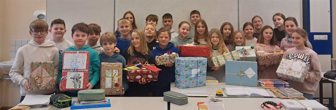 Etwas Gutes tun, und das gemeinsam: Die Schülerinnen und Schüler der Klasse 5a sowie drei Schüler der Klasse 5b haben in den letzten Tagen fleißig Päckchen gepackt. Bevor sich die Kinder für das offizielle Foto aufreihten, konnte Klassenleiterin Skadi Wölkert einen Blick in die liebevoll zusammengestellten Kartons werfen. Süßigkeiten, Puzzlespiele, Bücher und sogar ein Pullover warten auf das Auspacken zu Weihnachten. Die Päckchen-Aktion kommt der Tafel in Buckau zugute.