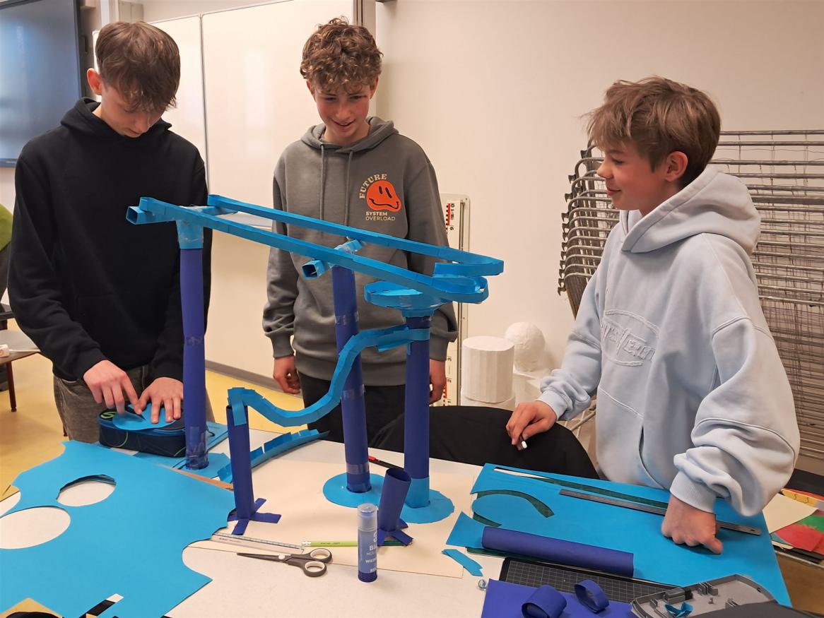 Papier kann kreativ eingesetzt werden - im Kunstunterricht der Klasse 8b entstehen mit diesem Stoff derzeit fantasievolle Murmelbahnen. Von der Skizze über das Gestalten einzelner Bauelemente bis hin zum Zusammenbauen arbeiten die Jungs in kleinen Gruppen.