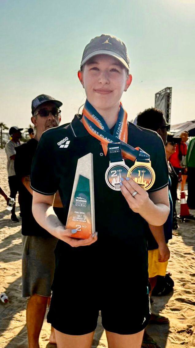Drei von fünf Quali-Rennen im Alpen Open Water Cup hatteElftklässlerin Renee Gold gewonnen und somit auch dieGesamtwertung für sich entschieden. Damit qualifizierte sich Reneefür das Finale dieser Wettkampfserie in Dubai. 1200 Starterinnenund Starter aus 55 Ländern in fünf Wettbewerben sorgten am KiteBeach für eine eindrucksvolle Kulisse. Renee Gold konnte dasRennen der Juniorinnen gewinnen und belegte in der OffenenKlasse der Damen den zweiten Platz. Herzlichen Glückwunsch!