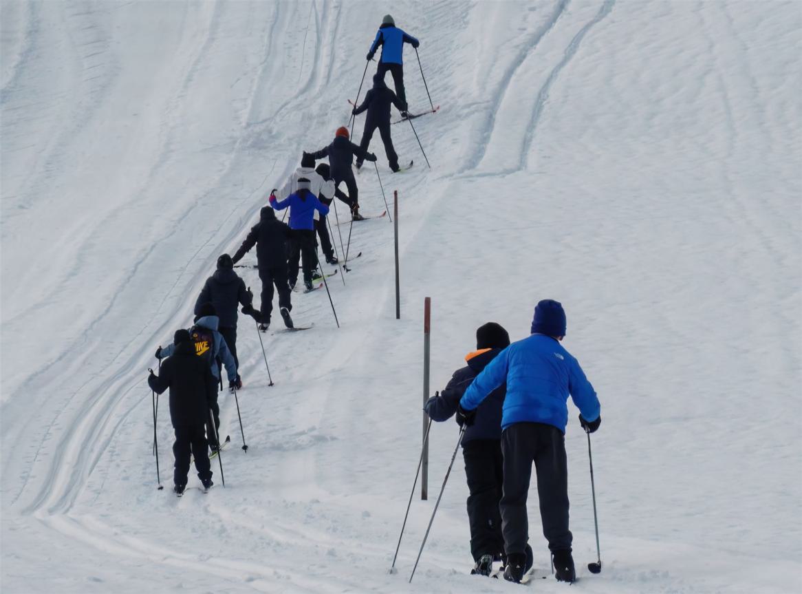 Der zweite Ausbildungstag stand ganz im Zeichen der Lernfortschritte. Während die Abfahrer vorwiegend verschiedene Schwünge mit paralleler Beinführung übten und festigten und auch schwierigere Passagen fuhren, konnten auch die Langläufer erste Hügel bezwingen und an ihrer Laufgeschwindigkeit arbeiten.